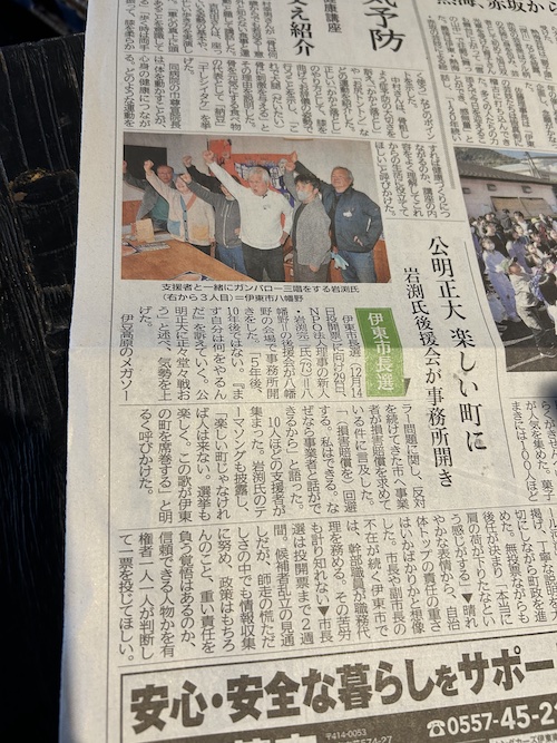 事務所開きが伊豆新聞に掲載されました 2025年12月1日 最終更新日時 : 2025年12月1日 広報:冨樫 12/1(月)伊豆新聞の1面に一昨日前に行なった事務所開きの記事が掲載されていました。 好意的な内容で、伊豆新聞さんに感謝!です。